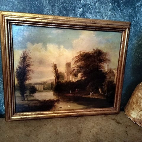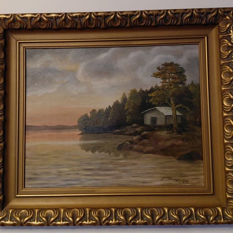 Myytävänä silmiä hivelevän hieno maalaus, joka on luonnossa vielä paljon upeampi kuin kuvissa. Maalauksessa on kuvattuna rauniot jokimaisemassa, jossa taiteilija on saanut kuvattua erityisen upeasti pilvien takaa siivilöityvän auringon kajon. Todella hieno maalaus mihin tahansa paraatipaikalle!