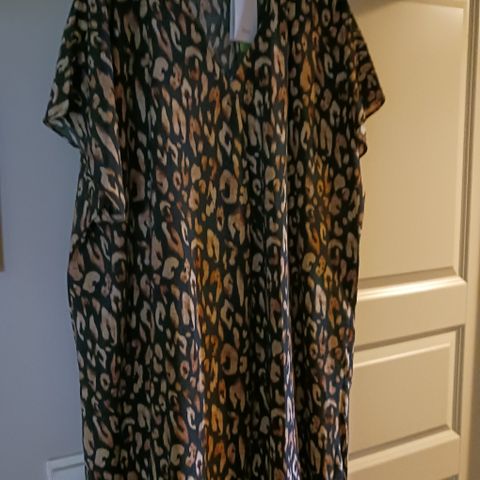 Zaran mekko pantterikuosissa. Koko L, mutta pienehköä mitoitusta, M-kokoiselle passeli. Materiaalilappu irroitettu, mutta tuntuu viskoosilta. Kai-kai 50 cm, pituus 80 cm.