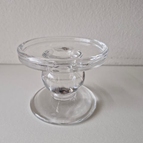 Kirkas lasinen kynttilänjalka, joka on valmistettu lasista. Sen muotoilu on koristeellinen ja se soveltuu pöytäkoristeeksi tai kynttilän tukemiseksi. En ole varma valmistajasta.