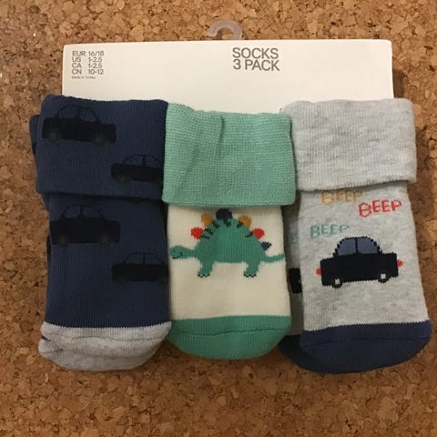 Auto sukat ja dino sukat ovat paksumpia . Koko 16/18 suunnilleen.
