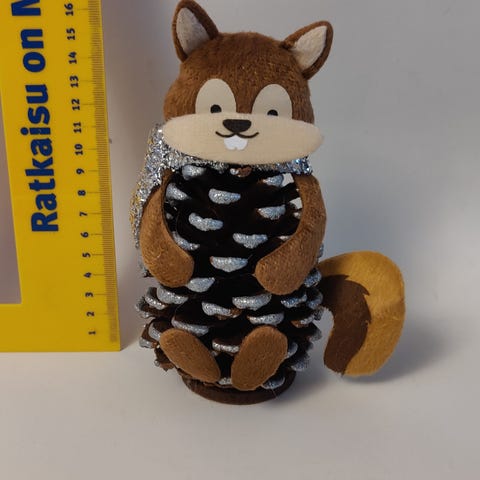 Neljä koristeoravaa. Sisusta on styroxia, päällyste puukuitua. Kahdella oravalla on siniset satiini tonttulakit, joissa valkoinen vanureunus. Oravan korkeus n. 15 cm ja leveys n. 15 cm. Kaikki neljä hintaan 7 €