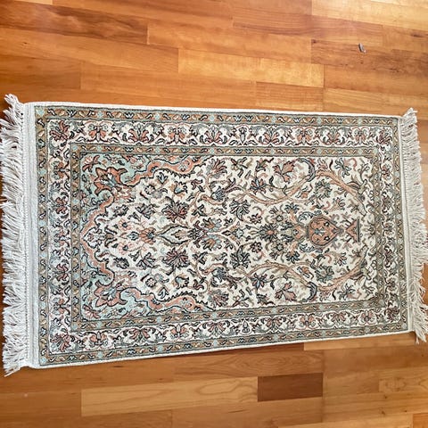 Sinipohjainen harvinainen matto, jossa on keskellä koristeellinen kuvio ja reunassa koristeellinen kuvioraita. Materiaali silkki ja villa. Koko 200 x 140 cm.