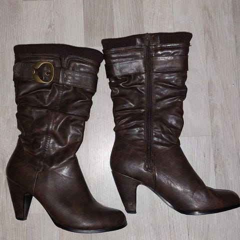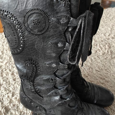 Mustat Super mode merkkiset saappaat korko 10 cm mahtuu hyvin 38 jalkaan vaikka koko on 37.