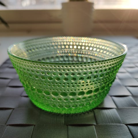 Iittala Kastehelmi kulho, vihreä väri, tilavuus 230 ml. Valmistettu lasista, koristeena helmiäismäinen kuviopinta. Soveltuu esimerkiksi tarjoilukulhoon tai koriste-esineeksi.