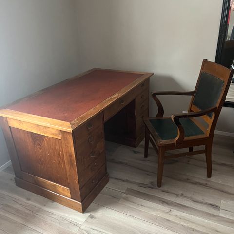 Myydään kaunis vanha kirjoituspöytä. Pöydässä on yläosa pienillä laatikoilla ja avolokerolla, vetotaso kirjoittamista varten sekä kaksi isompaa laatikkoa alhaalla. Koristeelliset sorvatut jalat ja tumma melkein tummaan luumuun taittuva sävy.