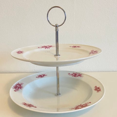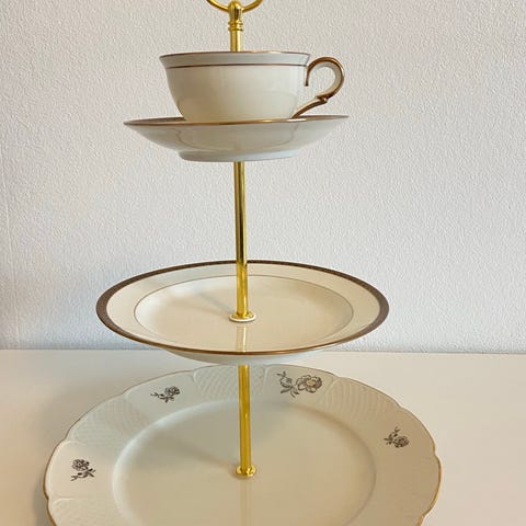 Kaunis itse tehty kerrostarjotin vanhoista Arabian Celsa- ja Maisema-lautasista. Juhlapöydän kattauksen tai kello viiden teen tarjoilun katseenvangitsija.