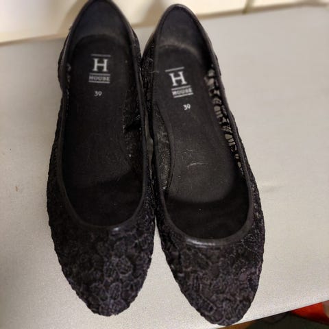 Myydään valkoiset hopeisilla yksityiskohdilla varustetut pitsiset ballerinat.