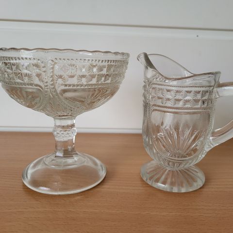 Riihimäen lasin sokerikko ja kermakko. Oikein hyvässä kunnossa. Kermakon korkeus n. 8cm ja sokerikon 7cm. Hinta yhteensä 10 euroa. Nouto Veneskoskelta tai postit ostajalle.
