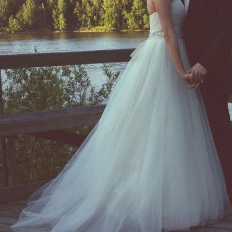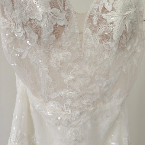 Turun Fianceesta vuonna 2025 ostettu käyttämätön ja muokkaamaton Morilee Renee 2093, koko US 10, väri ivory-rose-nude ja pituus 55''. Osassa kuvista vastaava mallipuku, uusi puku on lyhyempi. Menee noin 170 cm pituiselle morsiamelle. Itse olen 160 cm ja korot n. 5 cm ja pukua olisi pitänyt hieman lyhentää. Kimaltava roosaan taittava aluskangas ja upea laahus.