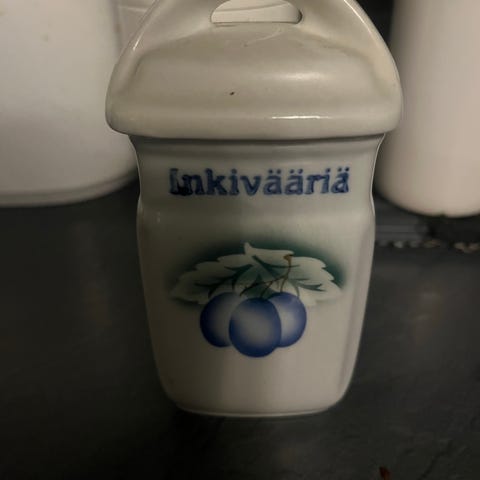 Arabia valmistama maustepurkki, jonka muodon on suunnitellut Ulla Procopé ja koristeen Esteri Tomula. Pohjassa merkintä "EK". Mitat 6,2x6,2 cm, korkeus 8 cm ja korkin kanssa 9,5 cm. Purkkia on valmistettu 1962-67.