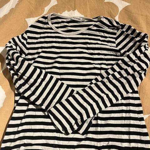 Marimekon punainen pitkähihainen raitapaita, jossa on nepparikiinnitys.
