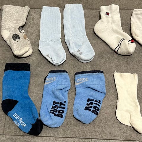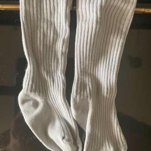 Neljät valkoiset pitkävartiset sukat, vastaavat mielestäni 13/15 kokoa eli noin 0-2kk ikäiselle. Ehjät ja tahrattomat, vähän pintahaitua/nyppyä, kts.kuvat.