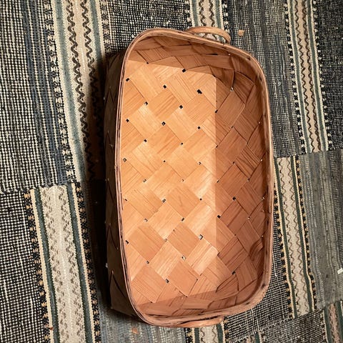 Päreistä tehty vanha kori jossa pohjassa vahvikkeet.