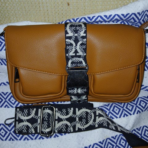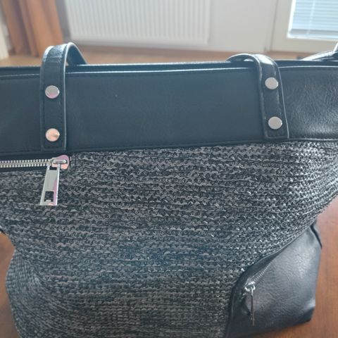 Pehmeä ruskea hyväkuntoisen nahkapaloista tehty olkalaukku. Olkahihna, käsikahvat. Laukussa kantokahvat. Sisällä yksi vetoketjullinen sivutasku Korkeus 33 cm, leveys 40 cm.