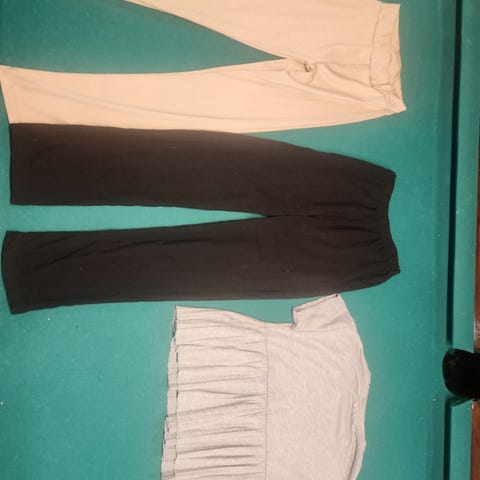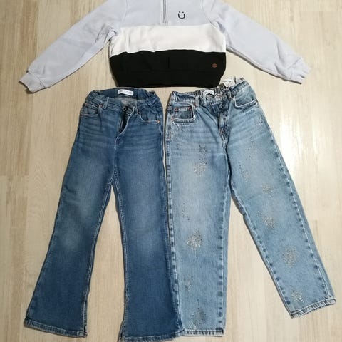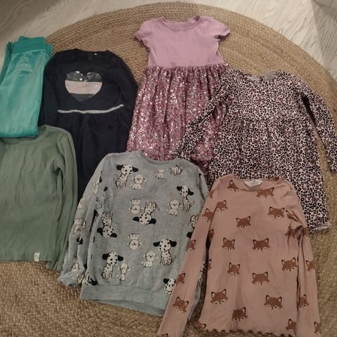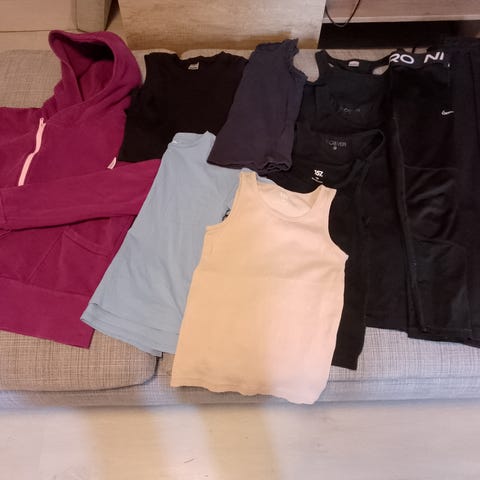 Siistiä arkivaatetta tytölle. Kulumaa ja käytönjälkeä on, mutta yleisilmeeltään siistiä. Yksi toppi ratkennut saunasta (kuvassa).
