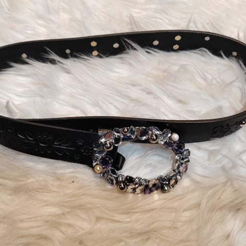 - viisi reikää, joissa kulumaa, kuva toiselta puolelta, vyötä voi kahdella eri tavalla, toisella puolella kangas
