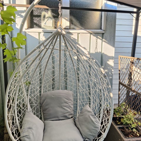 Meillä jäi liian vähälle käytölle tällainen riipputuoli. Myydään telineineen päivineen. Itse tehdyt pehmusteet saa mukaan!