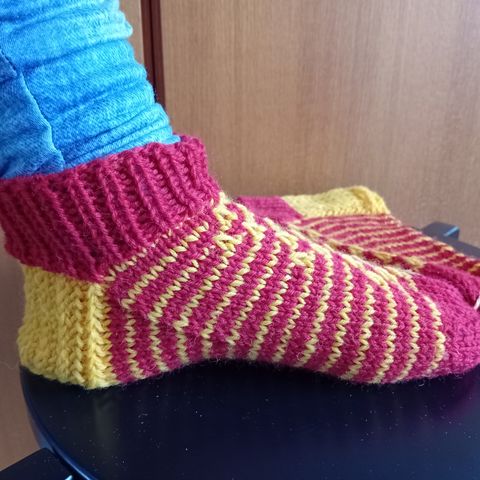 Kuvan Harry Potter-sukat, joissa lukee pöllön kuvan alla Harry Potter. koko 35-38. vaalean harmaalla pohjalla varressa kaksi viininpunaista raitaa, kuva vaalea ja teksti keltainen. pesunukkaa ja käytönjälkiä näkyvissä.