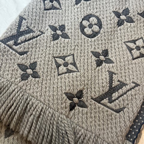 Myydään aito Louis Vuitton Logomania Shine Scarf (ruskea, monogram-kuvio).