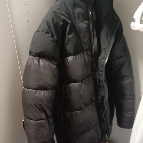 L kokoinen musta tuulitakki. Kevyt, sopii kevääseen ja sykseen. Rinnassa käärmeen kuva ja hihoissa valkoiset yksityhiskohdat.