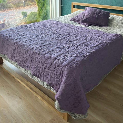 käsitehty vaaleanpunainen päiväpeitto ja kaksi tyynyä