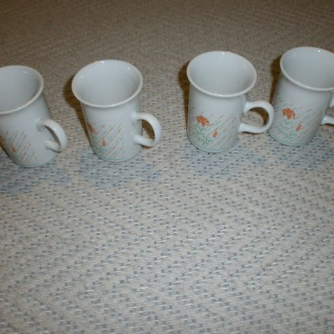 Vanhat muoviset matkamukit. Kuntoluokka kohtalainen, koska osan yläreunassa puremajälkiä. Muuten ei käytönjälkiä. Mukit saa päällekkäin tuohon "telineeseen", jossa Uusitupa LKV:n mainos. Ovat varmaan ainakin 20 vuotta vanhoja. Kaikki samalle, yhteishinta.