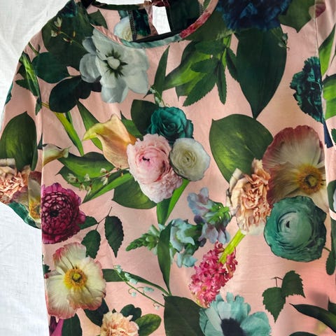 Ihana silkkipaita wonder-kankaasta. Värit kirkkaat, ei läikkiä, enkä muutakaan moitittavaa huomaa. Kai-kai 50 cm, olka-helma 44cm. Niskassa nappikiinnitys.