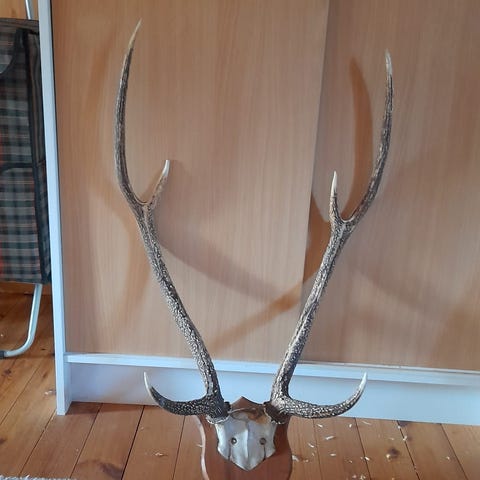 Aikoinaan käytettynä ostettu, joten ei tietoa kenen eläimen sarvet/kallo kyseessä. Taustalevy mennyt rikki, sitä ei enää ole. Sarvet hyvässä kunnossa, kallo varmaan käsittelemätön.