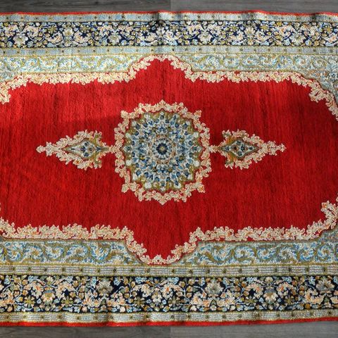 Kunto: Ehjä ja tahraton. Vähäistä käyttökulumaa. Hapsuissa kulumaa ja lievää vaaleanpunaista värjäytymistä. Toinen pääty epäsäännöllisen mallinen ja loimien päätysolminta yhdessä kulmassa auennut (katso lähikuva).