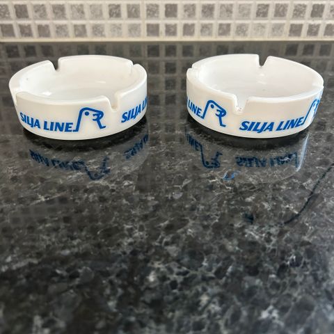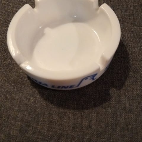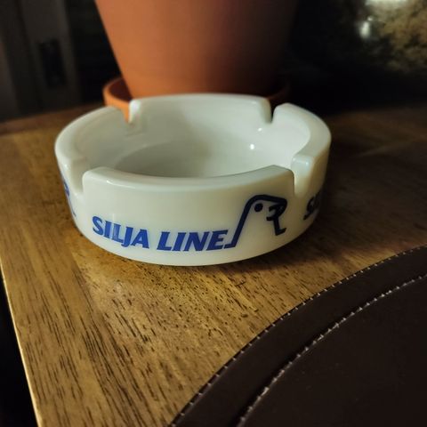 Valkoinen Silja Linen vanhempi tuhkakuppi. Ehjä. Halkaisija 10,5cm. Korkeus 3,5cm.