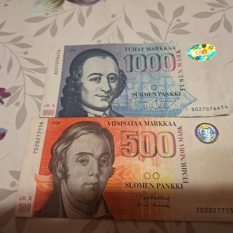 Kehyksissä kullatut 500mk ja 1000mk setelit