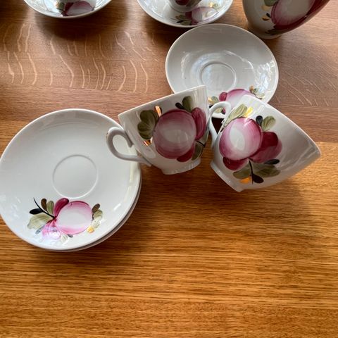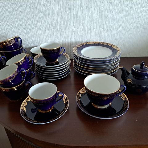 6 kuppia+aluslautaset, tee-/kahvikannu sekä iso sokerikko. Koboltinsininen vain kerran käytetty astiasto. Kultaukset reunoissa.