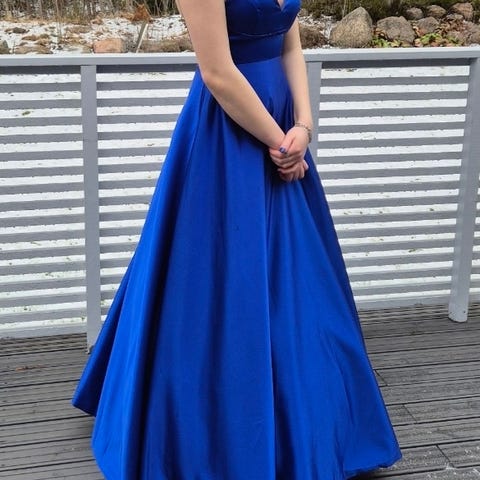 Ompelijalla teetetty simppeli vanhojen tansseissa käytetty mekko. Kahisevaa paksua kangasta. Mukaan alushame tylleillä ja pussukka.
