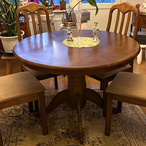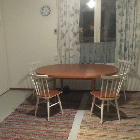 Pikkupöytä 6598. Pyöreä pöytä olohuoneeseen halkaisija 89/Kork.52. Sekä 2 tuolia 05 APR 1998. Ehkä on varastossa vielä 2 tuolia samaa sarjaa, mutta varasto on kauempana? Myyn kaikki yhdelle ostajalle,joka tuo rahat ja noutaa itse. Nyt muuton takia,ennenkuin vien nekin varastoon, sieltä on vähän vaikea kaivaa muiden tavaroitten joukosta ja tulee vain naarmuja. Sadeilmoilla olen varmemmin pakkaamassa ja vastailen aamuisin tai illalla, en ole netissä koko päivää. Vastailen, jos laitat torin viestien kautta numerosi tai s-postin. Sovi hakuaika ajoissa. Tarjotakkin saa, mutta 50e tarjoajat voi unohtaa