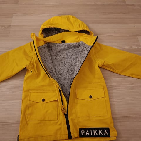 Swedemount keltainen sadetakki kokoa 130. Olikin tytölle hieman liian nafti ja jäi lojumaan...
