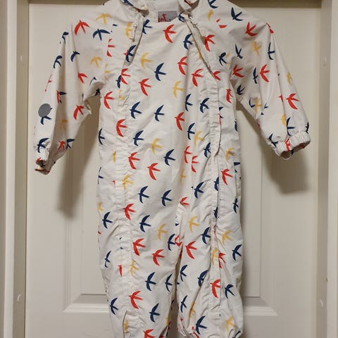Lindex lasten haalari, koko 86, sininen väri, unisex-malli. Haalarissa on hupullinen malli ja lintukuosi. Soveltuu käytettäväksi lasten ulkovaatteena viileämmillä säillä. Ohut tuulihaalari ei kestä vettä tai ole mitään vuorta. Siisti ja ehjä kuitenkin käytön jälkeä voi olla. Koko ei vastaa ollenkaan mennyt 78-80 koossa paremmin varsinkin jos pitkät raajat