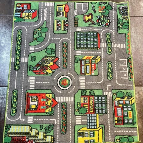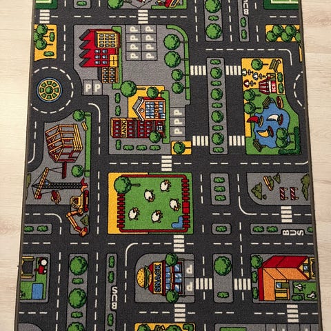 Lasten leikkimatto, jossa on kaupunkikuvioita ja teitä. Matto on valmistettu pehmeästä materiaalista, jossa on värikkäitä kuvia taloista, teistä ja liikenneympyröistä. Maton mitat ovat 150×100cm. Yhdestä kohtaa on vähän lähtenyt lankaa, leikkimistä ei haittaa.