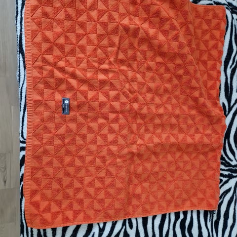Läjä Luhta pyyhkeitä. Kaksi kylpypyyhettä ja viisi käsipyyhettä. Kaksi reunimmaista käsipyyhettä uusia. Muita käytetty.