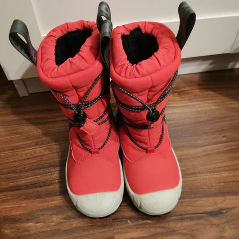 Yhden talven käytetyt kengät melko siisteinä seuraavalle. Täysin ehjät ja vedenpitävät mutta jonkun verran käytön jälkeä. Ei pesty mutta jos ostaja toivoo niin laitan pesun kautta. Tarranauhoissa hiukan roskaa mutta pitävät. Olisin harjannut ne mutta tarranauhaharja on hukkateillä, suosittelen sellaista jollet jo omista. Tarrat saa kyllä täysin puhtaiksi. Hinnassa huomioitu puutteet.