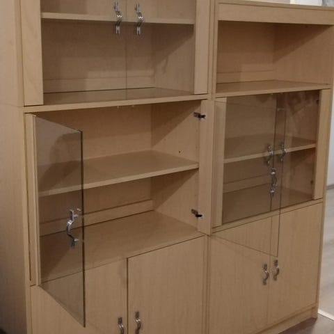 Annetaan ensimmäiselle noutajalle valkoinen lasikaappi jossa 2 lasihyllyä. Toinen lasiovi rikki, mutta muuten hyvässä kunnossa.