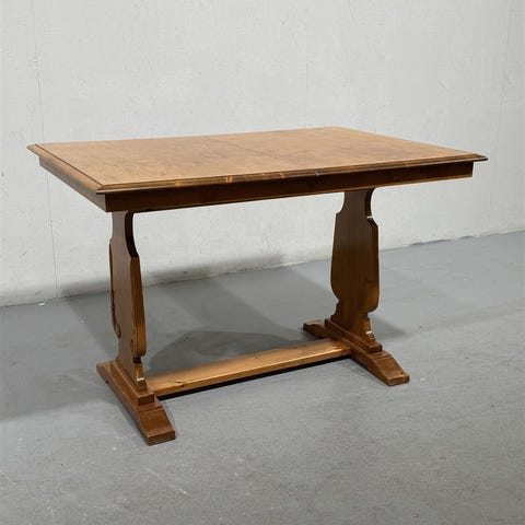 Suuri komea kuvan jatkettava ruokapöytä myytävänä. Molemmissa päissä pöydän alle liukuvat jatkot. Voi myös käyttää pelkästään toista päätä. Runko tukeva ja yleiskunto hyvä. Kannessa ja yleisesti normaalia käyttökulumista. Pöytä levyissä hieman kaarevuutta. Kannet irroitettavat.