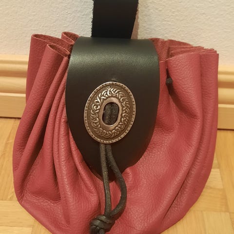 Musta-violetti nahkapussukka, pituus n. 18cm, korkeus n. 14cm. Käsityötä. Ostaja maksaa postikulut ja noutaakin voi Tampereelta.
