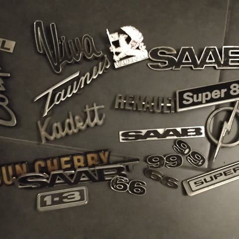 Autojen metallisia merkkejä, mm. Saab, Ford, Ifa, Austin, Opel...