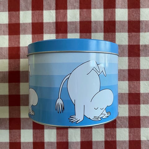 Iittala Moomin Martinex metallinen säilytysrasia, jossa on neljä erillistä lokeroa. Säilytysrasia on valmistettu metallista ja siinä on Muumi-aiheiset kuvitukset. Koiratalous.
