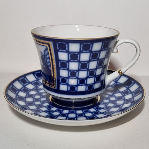 Lomonosov kuppi ja lautanen, ei halkeamia tai lohkeamia. Yhdessä parissa on jonkin verran käytön jälkiä.