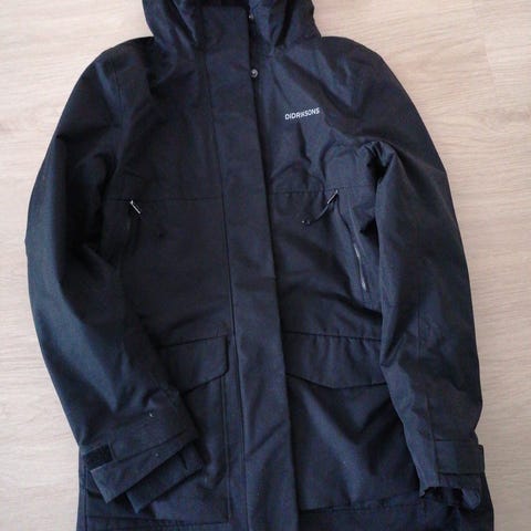Vähäiselle käytölle jäänyt Didriksons musta parkatakki. Koko 36, menee hyvin myös 38 kokoiselle.