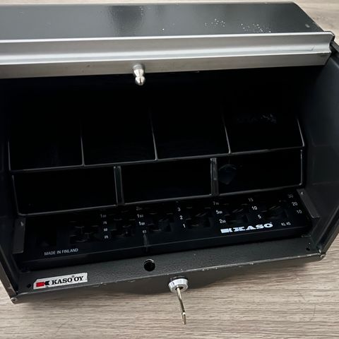 Myydään Kason käteisturvalokero, kuvien mukainen. Sisällä seteleille omat lokerot ja erillinen kolikkolevy. Käytönjälkeä Sopii vaikkapa pienyrittäjälle tai kioskiin. Sijainti Sörnäinen, vain nouto.
