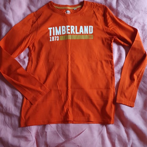 Timberland-merkkinen harmaa t-paita. Se on kokoa 174cm, joka vastaa kokoa M. Paita on pitkähihainen ja hyvin istuva, mutta ei ole tiukka. Edessä näyttävä grafiikka Timberlandin logolla.