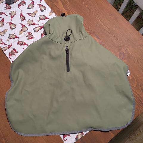 Myytävänä käyttämätön heijastava sadetakki. Koko 35. Valjaille aukko. Kaula-aukossa kiristysnyöri.