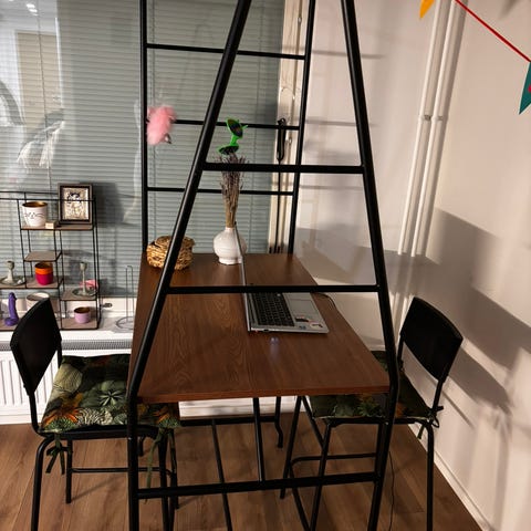 Kuvassa toinen pää pöydästä on kiinnitetty seinään. Toisessa päässä on kaksi säädettävää pöydänjalkaa. Ne voidaan myydä erikseen.